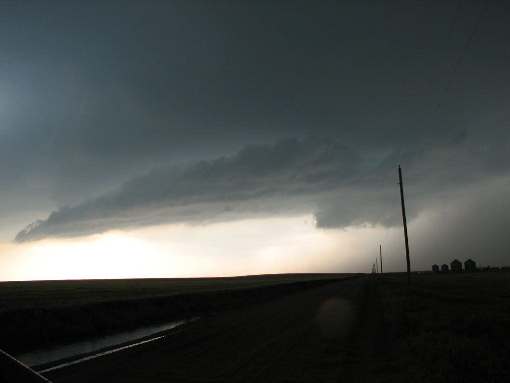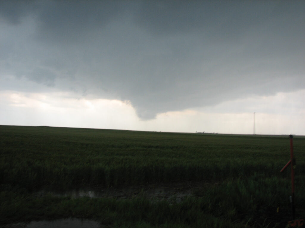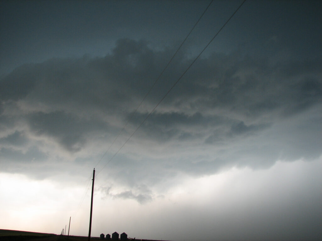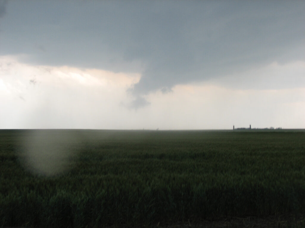Eventually a cell started firing near Protection, KS and we headed back southwest towards that cell. We were right under the cell when a tornado warning was issued for it. It dropped some very low clouds around us, and a funnel hung from the storm into the field right next to us. Lightning struck the phone pole right by us and scared us all half to death. We decided to move then and headed towards Greensburg in order to not get cored by hail.