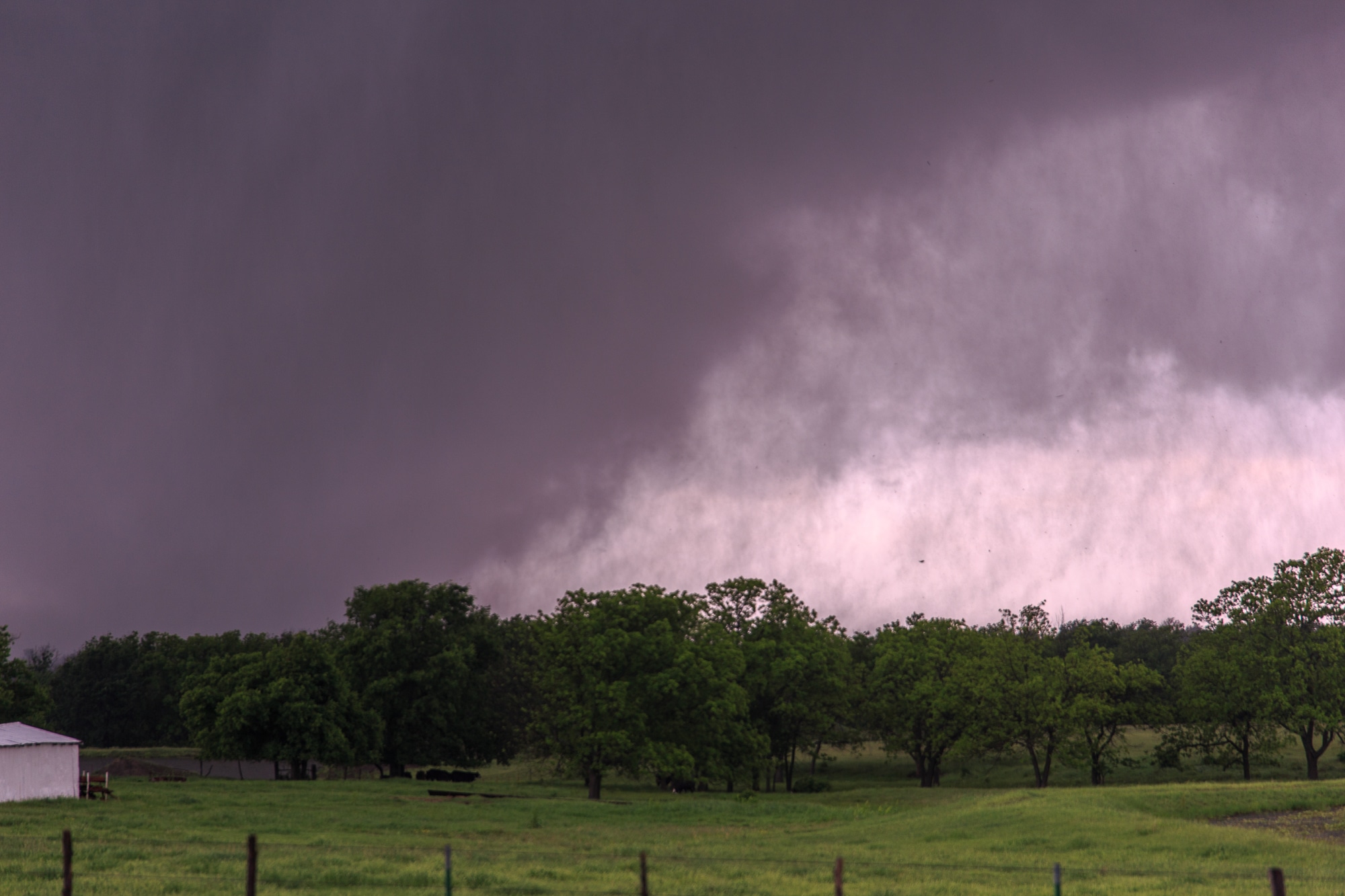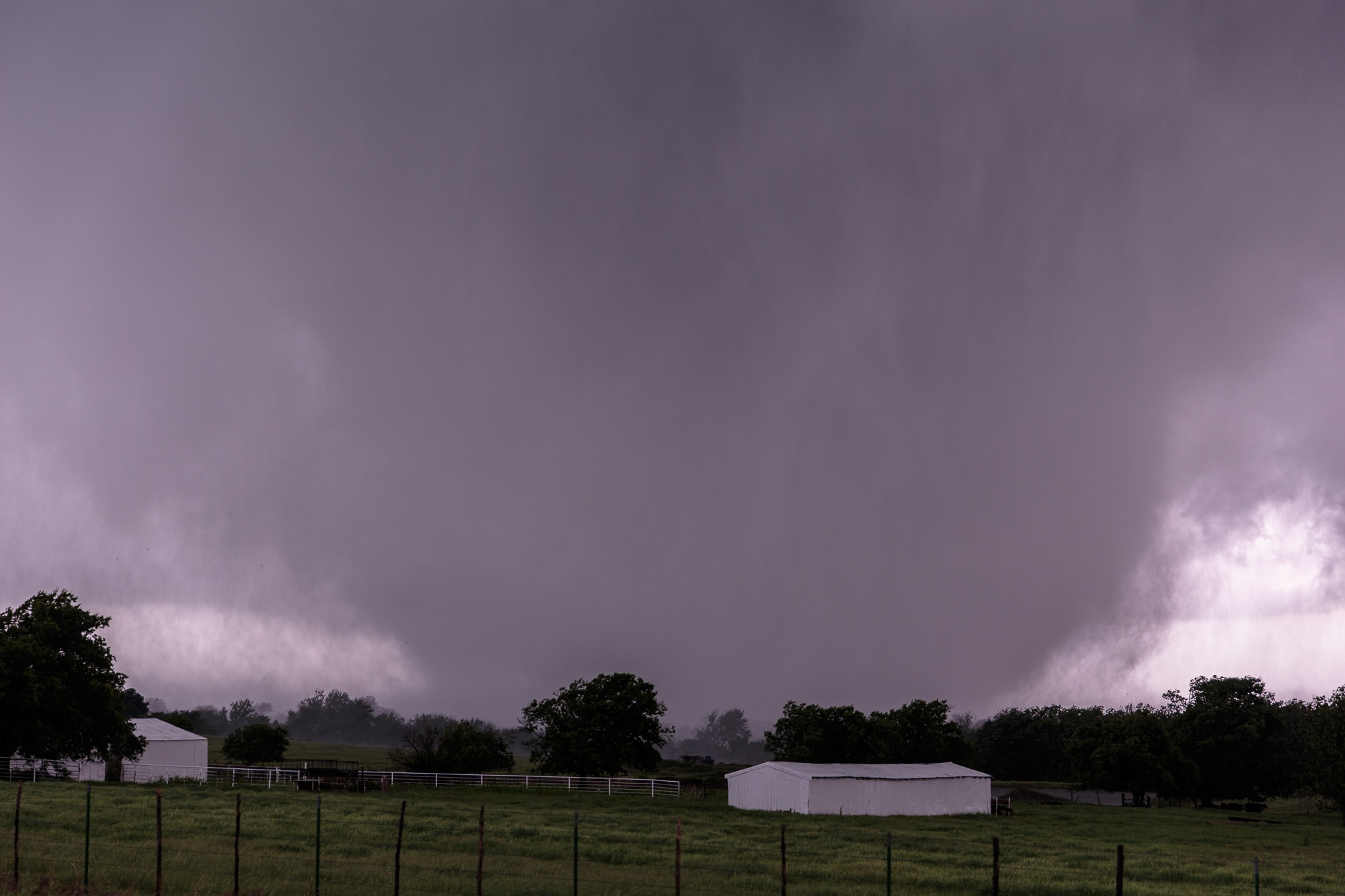 We headed east to US-77, with hail in the core up to golf balls. I realized quickly the roads east of US77 were garbage. We crossed under the storm on 77 and observed a cranking mesocyclone. There were intermittent touchdowns to the east of US-77. Unfortunately, there were no roads, so we had to continue south to highway 7 and east.