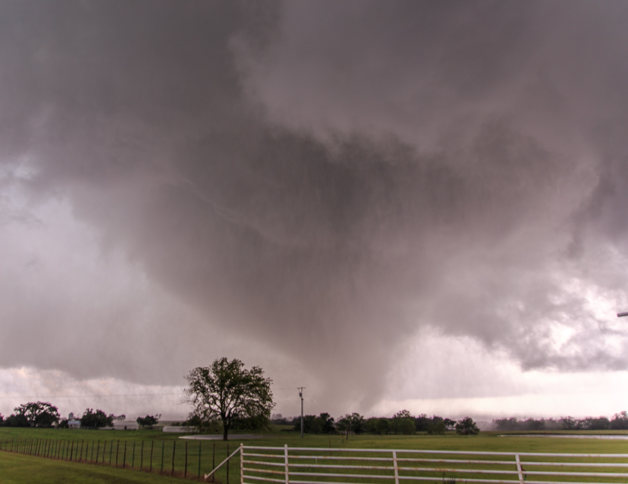 We headed south again on N3210 towards E1680, capturing some incredible footage as the tornado moved to the east, crossing N3210 south of us. We pulled south and just north of where it had crossed and got some incredible footage. The view of the beast ripping up the earth in Oklahoma is nothing short of amazing.