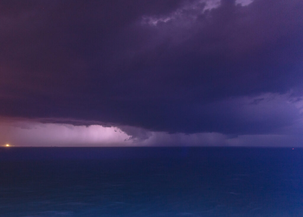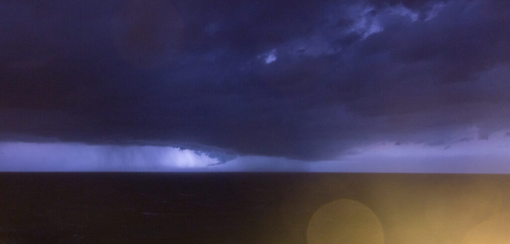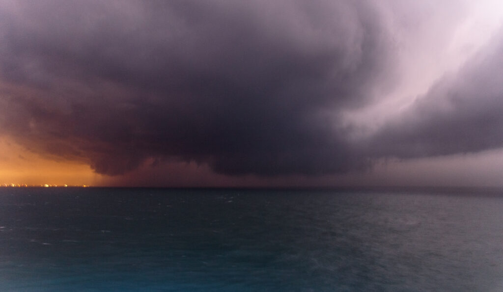As tornado warned supercells were exiting the Florida coast we found ourselves in the hook about 3-5 miles off shore from Cocoa Beach and in the vault region of a supercell. There was a great inflow band into the storm and a wall cloud underneath a sculpted meso. Eventually we got hit by RFD winds which were pretty intense. I was on the back of the ship outdoors, I think everyone else was inside. Other guests said that the boat was listing heavily and that dishes went crashing when the RFD hit, but I don’t know since I was outside.
