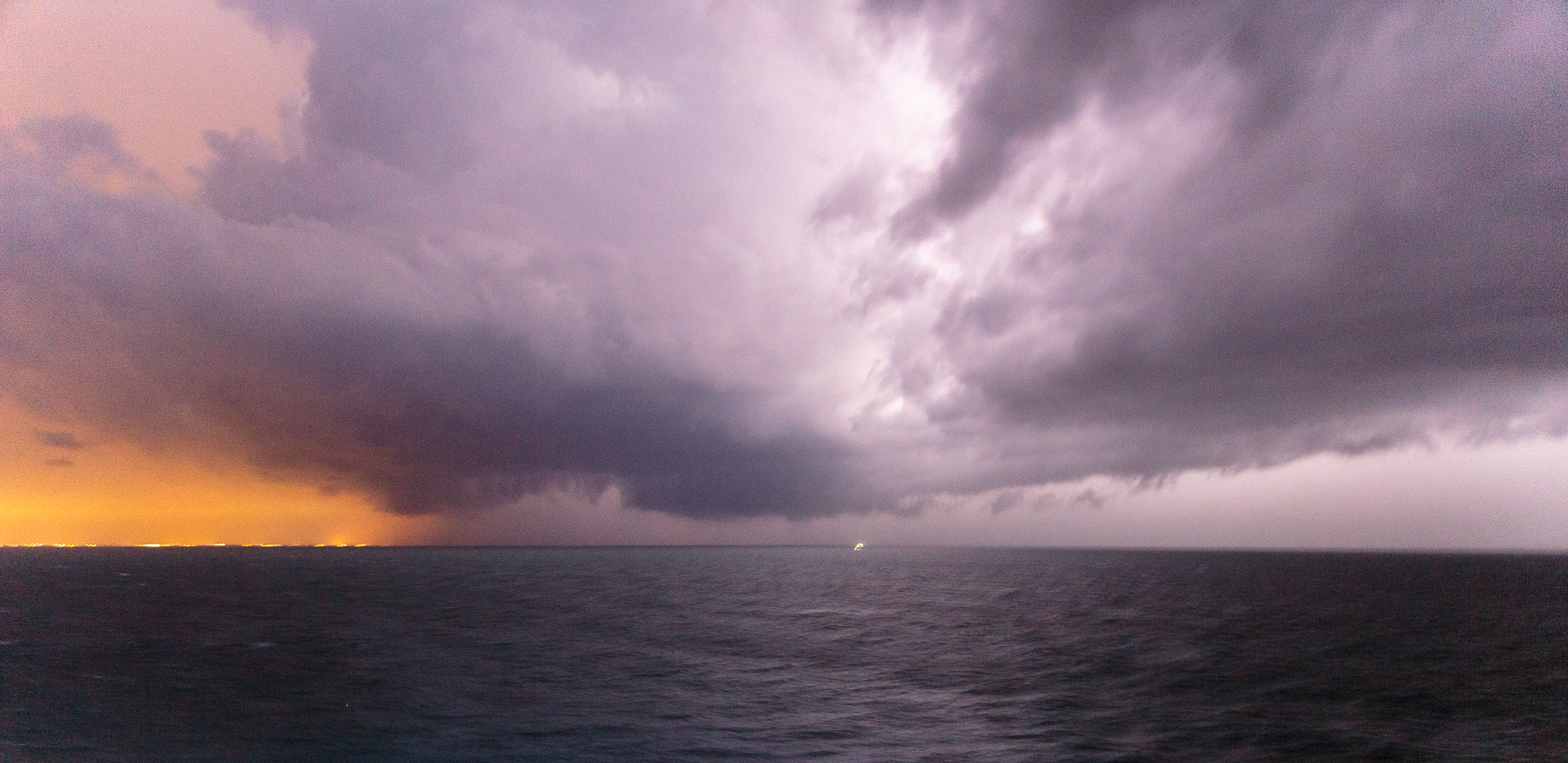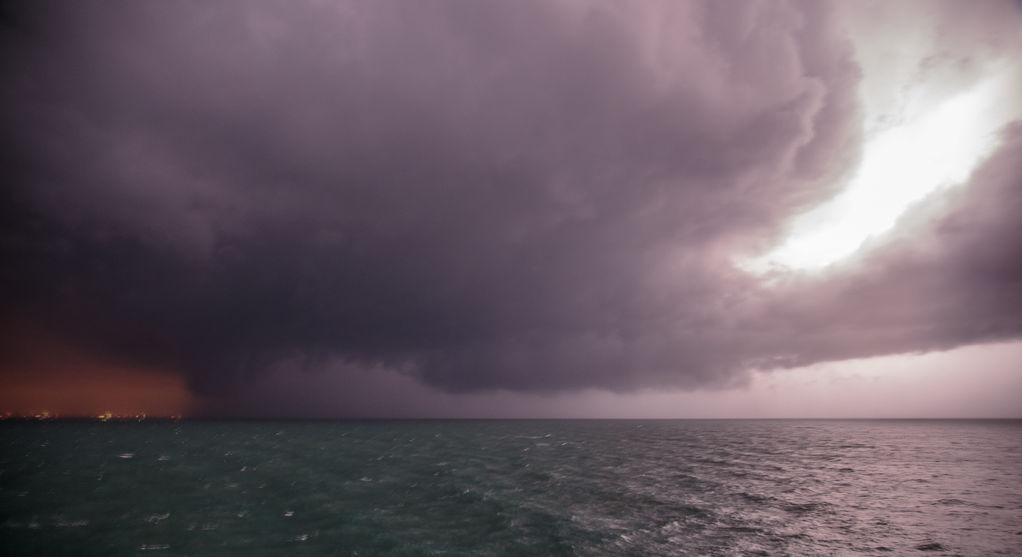 As tornado warned supercells were exiting the Florida coast we found ourselves in the hook about 3-5 miles off shore from Cocoa Beach and in the vault region of a supercell. There was a great inflow band into the storm and a wall cloud underneath a sculpted meso. Eventually we got hit by RFD winds which were pretty intense. I was on the back of the ship outdoors, I think everyone else was inside. Other guests said that the boat was listing heavily and that dishes went crashing when the RFD hit, but I don’t know since I was outside.