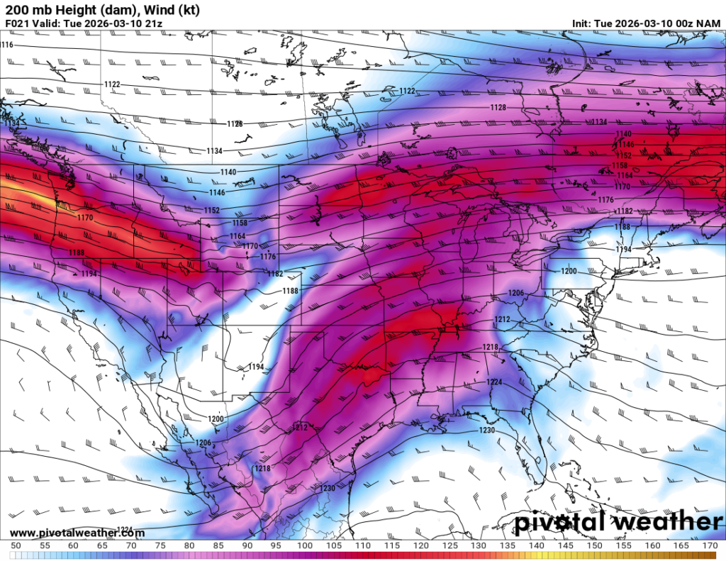 Looking out 2 full days, the evening RAP run on Saturday night March 7th (03Z on March 8) was showing the possibility of supercells in Central and Southern Oklahoma. With the main jet stream staying north, a cut off low over Northern Mexico and ejecting into Texas/Oklahoma in the late afternoon and evening hours. With the success I had with cutoff lows in 2012, I couldn’t ignore this system in the Southern Plains.