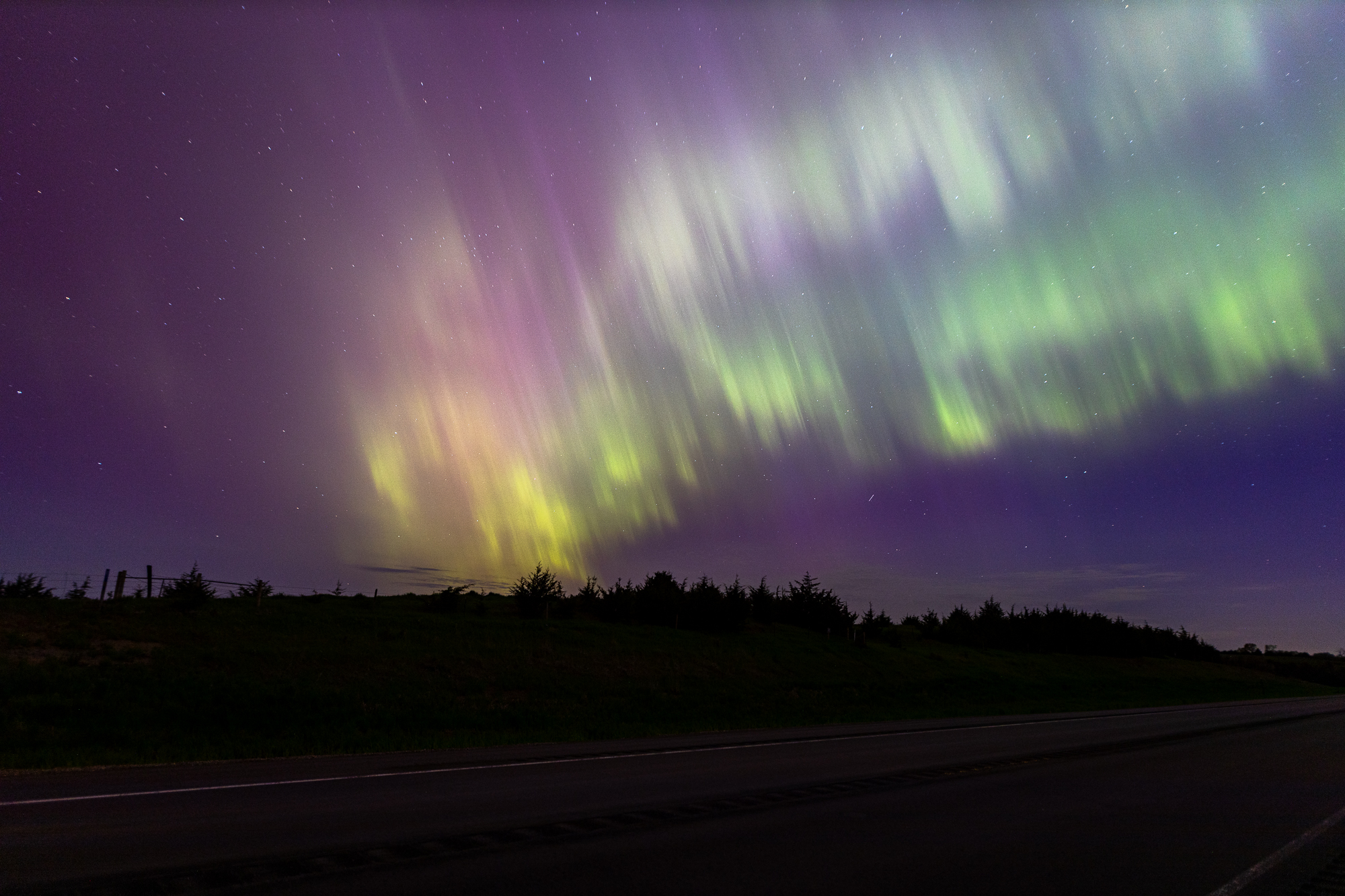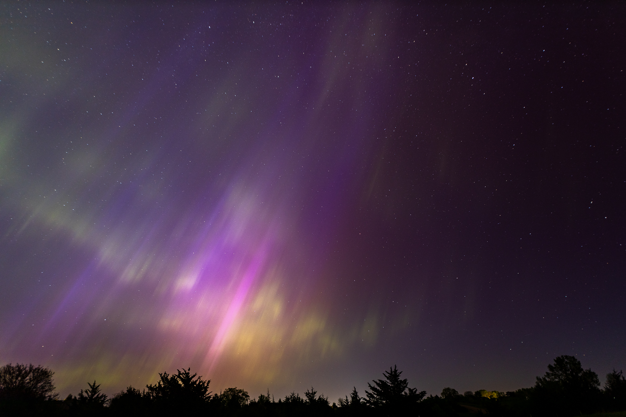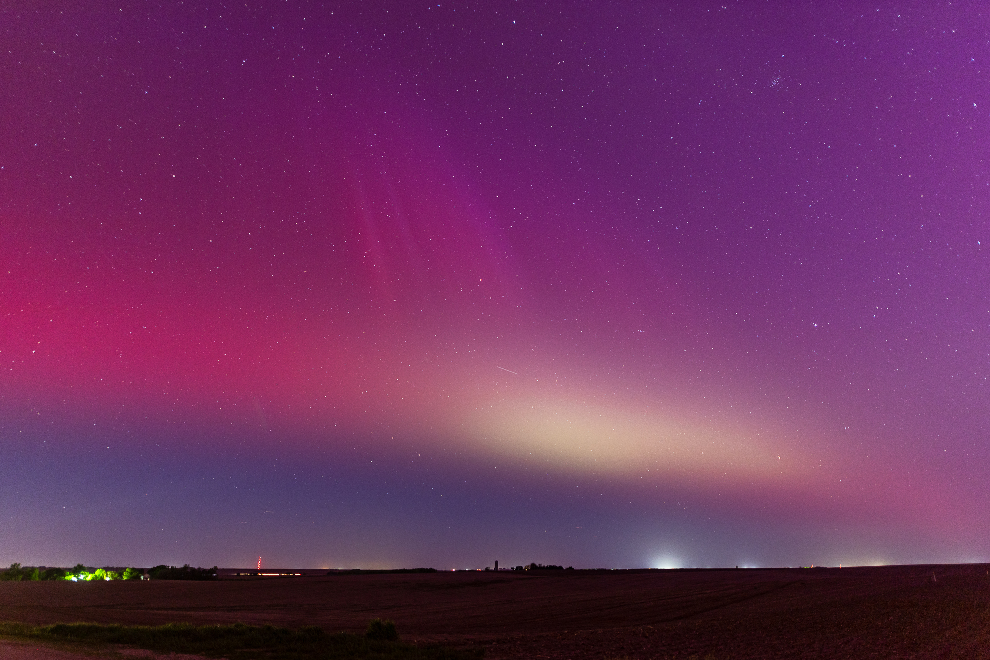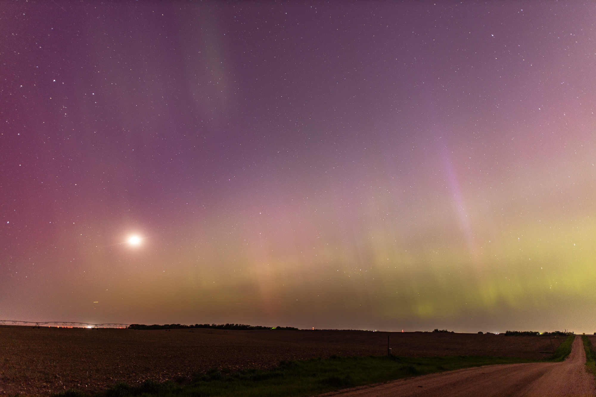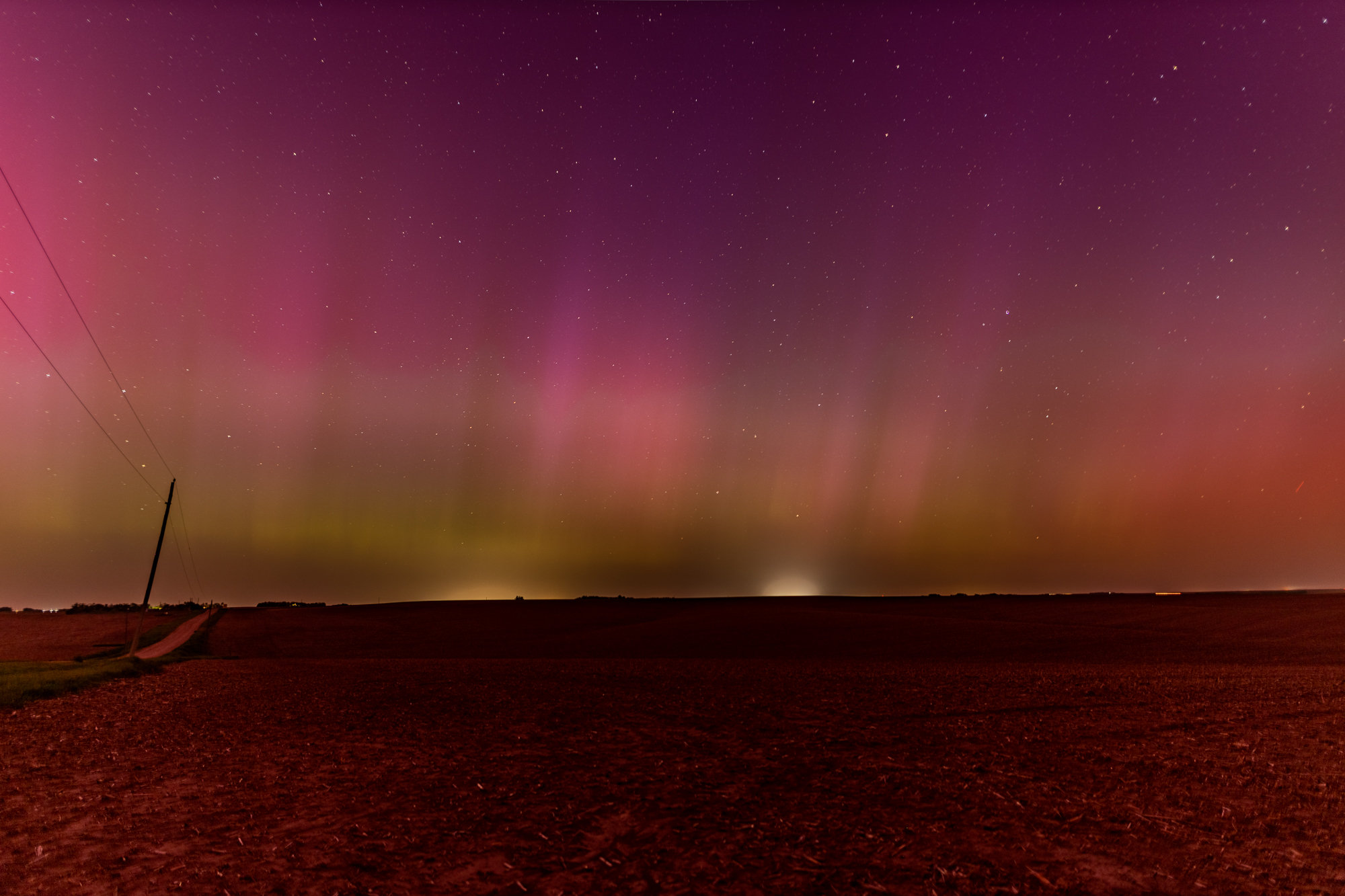 A massive geomagnetic storm hit the earth on May 10, 2024 and caused the most amazing aurora borealis I’ve ever witnessed. I was driving northbound throughout the day and booked a room in Yankton. As the sun went down I was between Columbus and Norfolk Nebraska. I found some dark areas on a desolate road near Kalamazoo, Nebraska to take photos.