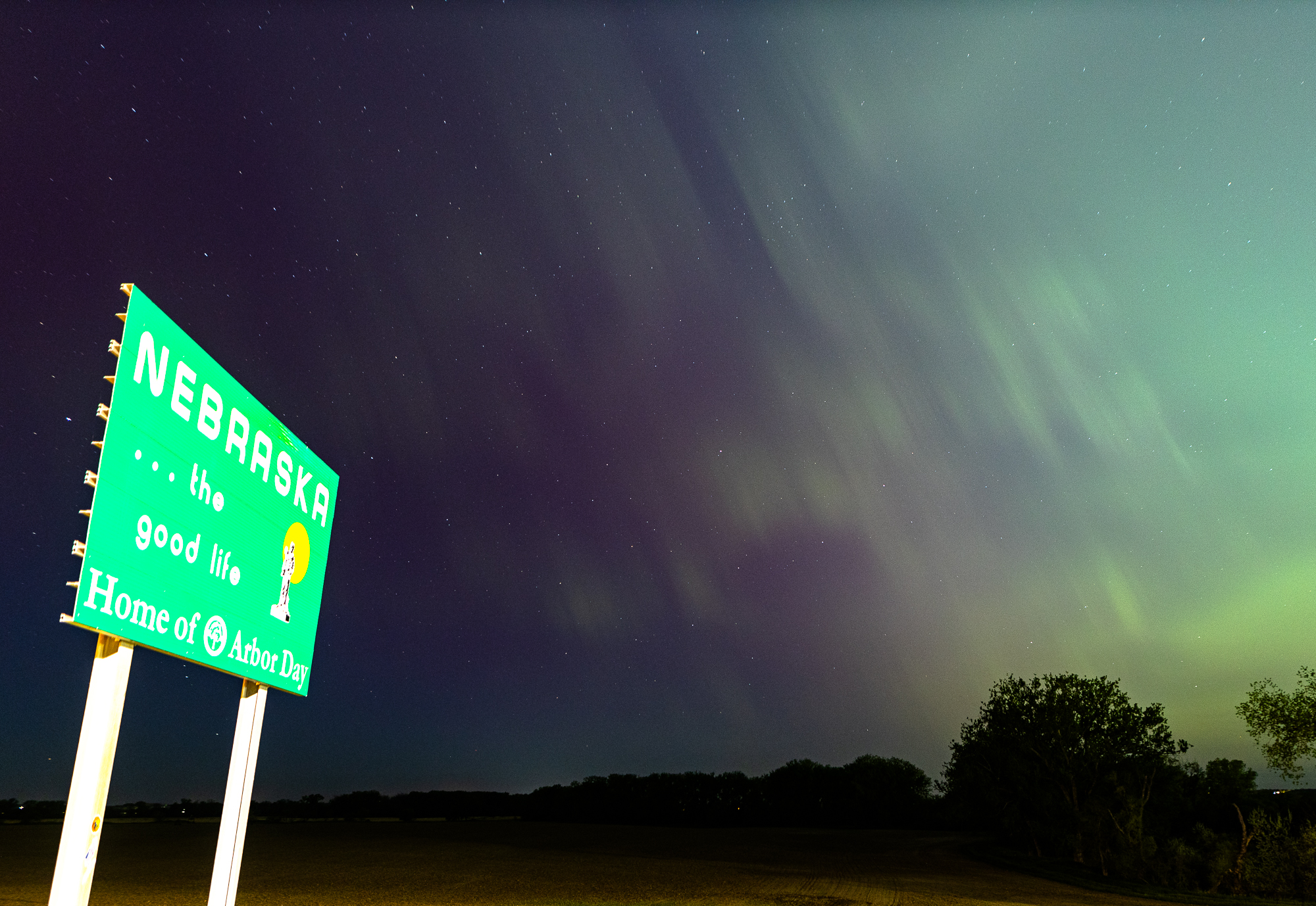 Since my hotel room was booked in Yankton, I headed up to the Nebraska/South Dakota border. I captured some images of the South Dakota and Nebraska state signs with aurora borealis.